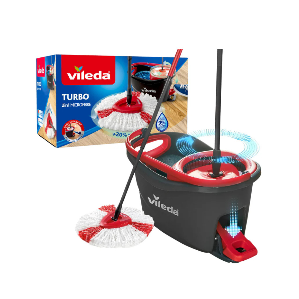 Vileda Turbo 2-in-1 Microfibre Spin Mop & Bucket Set is a practical spin mop and bucket system designed for effortless cleaning and effective dirt removal on all floors.